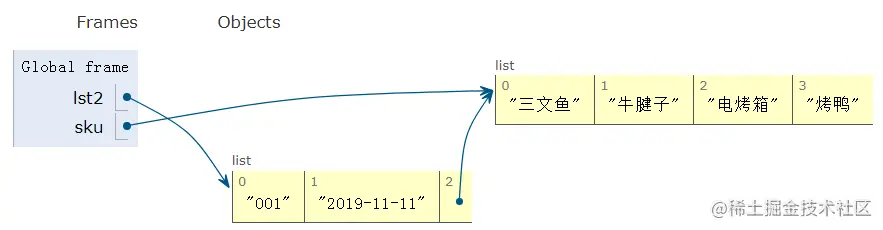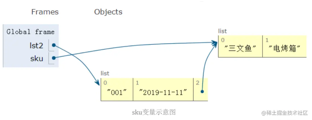 打印 lst2,发现第三个元素也对应改变,因为 sku 引用 lst2 的第三个元素,sku 指向的内存区域改变,所以 lst2 也会相应改变。