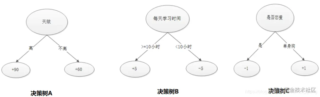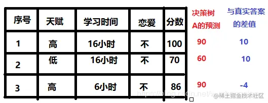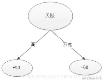 - 通过一个决策树A, 我们可以看到一个天赋属性的预测结果:天赋高的人+90, 不高的人+60
