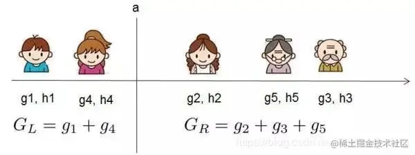 这个 代表了当我们指定一个树的结构的时候,我们在目标上最多能够减少多少,我们之前不是说建立一个树就是让残差尽可能的小吗?到底小多少呢?这个 就是衡量这个的, 可以叫做结构分数。就类似于基尼系数那样对树结构打分的一个函数。那么这个分数怎么算呢?看下面的例子: