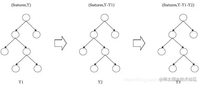 - 那么第三棵决策树训练时的输入,这个样本就变成了:[(feature1,feature2,feature3)->20]