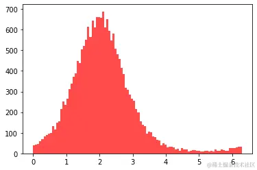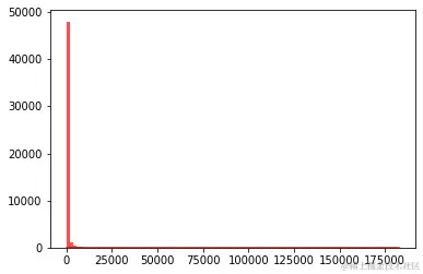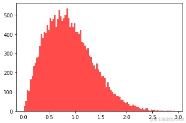 plt.hist(data, bins=100, color="#FF0000", alpha=.7)