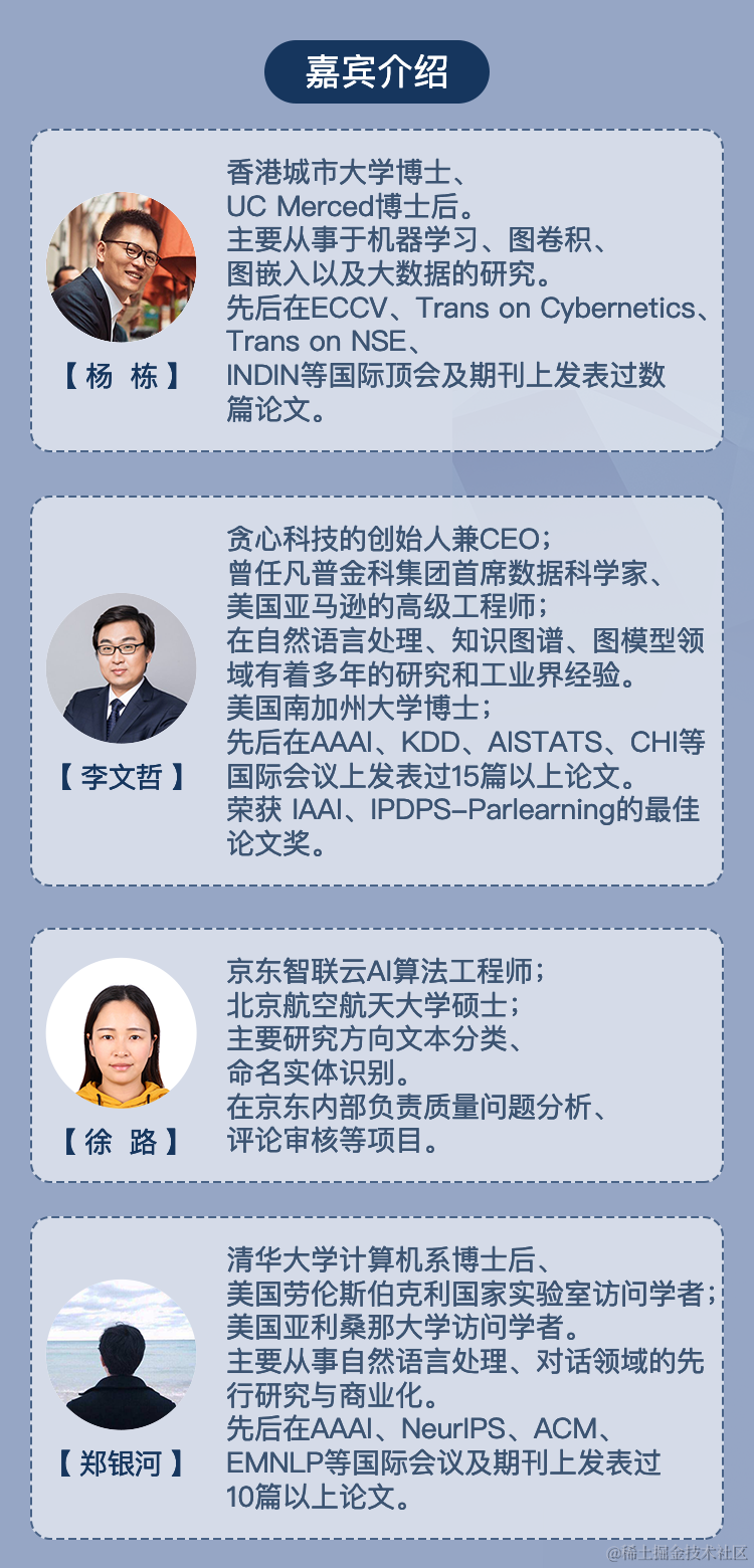 本次的专题活动,我们有幸邀请到了多位国内外NLP领域的专家, 均在各自领域中发表过数篇顶会文章, 也有幸邀请到了京东相关领域的专家。我们希望通过本次活动,给大家带来一些认知上的提升,充实自我!