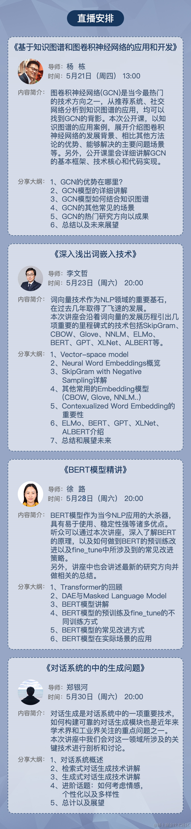 这次的系列课程我们又选择了近几年NLP领域最火的话题,包括GNN, GCN, Word2Vec, ELMo, GPT, BERT, 对话系统,个性化文本生成,知识图谱等内容。 作为一名NLP工程师,这些内容逐步在成为必修课。在本次专题活动,我们会通俗易懂地讲解每一个核心知识点,让大家知道背后的原理,这也是贪心学院一贯的讲授风格。