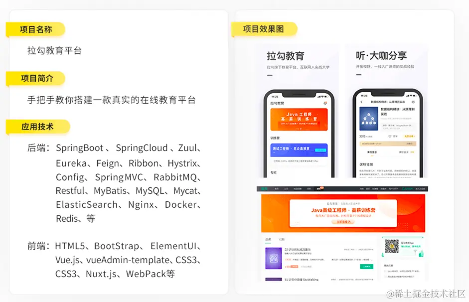 2、拿拉勾作为实战项目, 串联起整个 前后端 知识点 ,手把手带你搭建真实的在线教育平台;