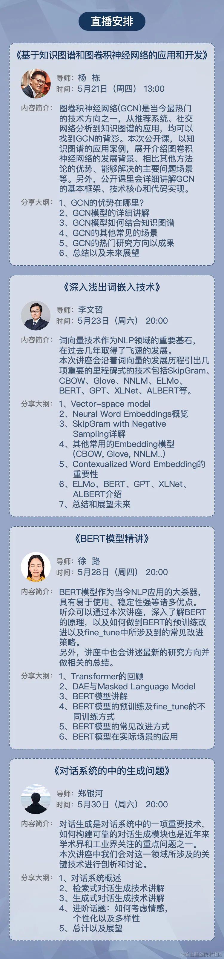 这次的系列课程我们又选择了近几年NLP领域最火的话题,包括GNN, GCN, Word2Vec, ELMo, GPT, BERT, 对话系统,个性化文本生成,知识图谱等内容。 作为一名NLP工程师,这些内容逐步在成为必修课。在本次专题活动,我们会通俗易懂地讲解每一个核心知识点,让大家知道背后的原理,这也是贪心学院一贯的讲授风格。