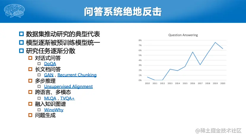 随着斯坦福大学SQuAD数据集的诞生,以抽取式阅读理解为代表的问答系统近年来引起了大量的关注。但是为什么说是“绝地反击”呢?主要是因为在更久之前,问答系统就曾经是信息检索和自然语言处理领域的热门研究方向,但是受限于当时的技术手段,答案准确率并不是很高,因此该研究方向曾一度被人们所冷落。经过这几年的发展,问答系统的模型逐渐被预训练模型所统一,因此今年ACL上的相关文章更关注问答系统的各个子任务或引入更多资源。