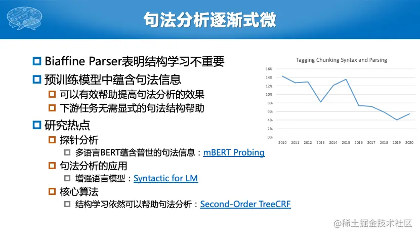 和机器翻译类似,句法分析这一曾经自然语言处理领域的当家任务也逐渐式微。其背后的原因有两个:一方面是因为Biaffine Parser的出现证明了结构学习这一自然语言处理的特色问题,对于句法分析并不重要;另一方面,预训练模型的出现使得句法分析的处境更是雪上加霜。预训练模型不但能大幅提高句法分析的效果,更重要的是其内部已经蕴含了句法结构信息,因此就无需为下游任务提供显式的句法结构了。由于这些原因,今年ACL上句法分析的热点也主要集中在了研究探针任务和句法分析的应用上了。不过苏州大学李正华老师所提出的高阶TreeCRF模型还是能进一步提升句法分析的效果,这一点非常难得。