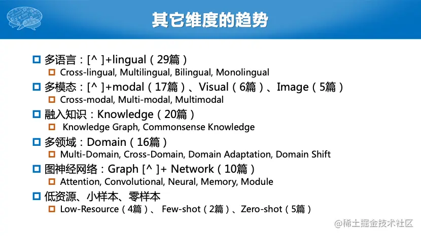 上面这些分析主要是从研究领域的趋势变化展开的,我们还可以从其它维度进行分析,来帮助我们更全面了解自然语言处理的研究。如下图所示,我们总结了今年ACL上几个热门的研究方向,如对多语言、多模态、多领域和低资源的研究,融入知识的方法,图神经网络的应用等。
