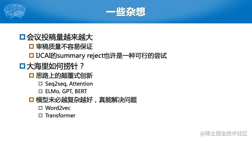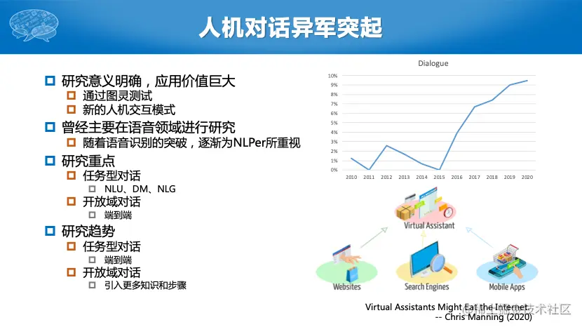 从这段视频中,我们可以看到几个非常明显的趋势,比如人机对话等新兴领域上升势头迅猛,而句法分析、机器翻译等传统领域有所衰落。下面,就几个变化比较明显的领域分别加以介绍。