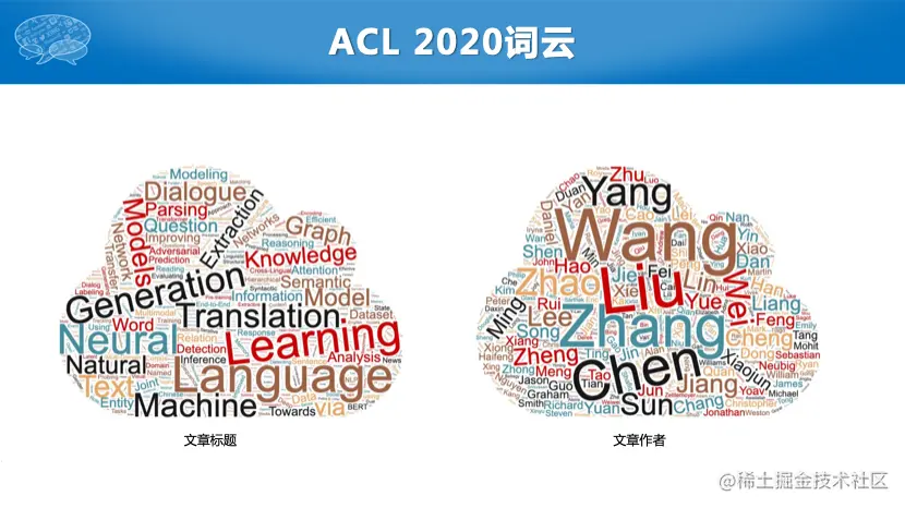 再来看一下今年录用文章标题的词云,从中可以看出大家关注比较多的任务有生成、翻译、对话、问答、抽取、句法等方向,用到的方法多涉及到神经、网络、注意力、图等。另外,从文章作者的词云可以看出前几名的基本都是中国的大姓,这也反应出华人作者在ACL顶会上已经占据非常大的比例。