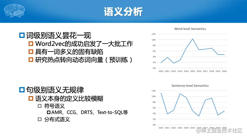 语义分析领域的情况稍显复杂,对于词级别的语义分析,当年受到Word2vec模型的启发,产生了一大批相关的研究,其影响力甚至超出了自然语言处理的范围,在知识图谱、推荐系统等领域都广受关注。而近年的预训练模型让大家将研究重点从之前这种静态词向量转移到了动态词向量等方向。至于句级别语义分析,本身的定义就比较模糊,很多任务都可以归为语义分析,如AMR、CCG Parsing等,当然它们也可以被归为结构分析(Parsing)类任务,所以趋势上有所波动。