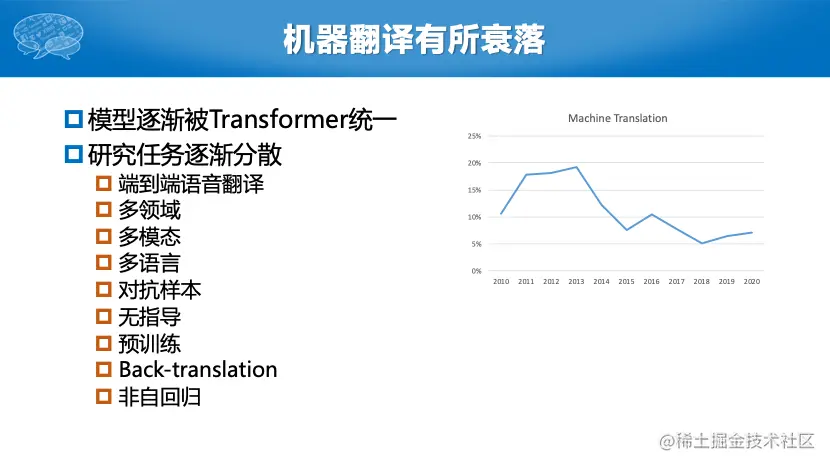 几家欢乐几家愁,由于上述领域的快速崛起,更重要的是由于模型逐渐为Transformer所统一,使得机器翻译这一“老牌”自然语言处理任务受关注的程度有所降低。今年ACL的相关研究也分散到不同的翻译场景设置上。