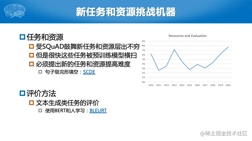 仍然是受预训练模型的影响,在很多刚被提出不久的自然语言处理任务上,机器的表现很快超过人类。因此最近有大量的研究工作试图提出对机器更具有挑战性的任务和资源,从而逼迫机器更像人一样“思考”。