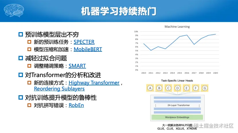 可以看到近10年来,机器学习的热度一直居高不下,特别是随着预训练模型的成功,NLP模型大有被大一统的趋势。下面的一些机器学习研究方向为今年ACL所重点关注。