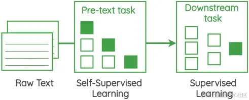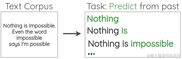 在这个公式中,我们取大量未标注的文本,并设置一个任务,根据前面的单词预测下一个单词。因为我们已经知道下一个来自语料库的单词是什么,所以我们不需要手工标注的标签。