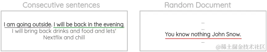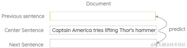 在这个方案中,我们取文件中出现的两个连续的句子,以及同一文件或不同文件中随机出现的另一个句子。