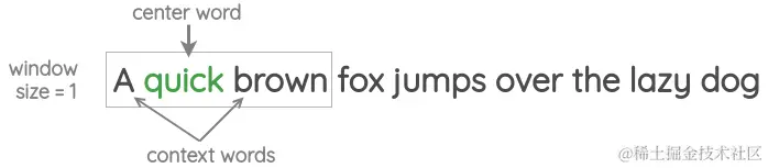 例如,在下面的图中,我们有一个大小为1的窗口,因此我们在中间单词的两边各有一个单词。使用这些相邻的词,我们需要预测中心词。\