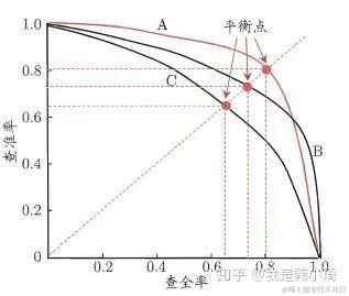 首先目前很多分类算法输出的都是0-1之间的一个概率值,比如逻辑回归、xgboost等,分类时的做法是预定一个阈值(典型为0.5),若对样本的输出大于此阈值则归为1类(即正例),那么根据样本的输出值从大到小排序(下文简称为“样本的排序”),排在最前面的即可理解为最有可能为正例的样本,而排在最后的是最不可能为正例的样本。从前往后,逐个将样本预测为正例(即把当前样本的输出值定于为阈值,小于阈值的都为反例),每次计算当前的查准率和查全率,即可得到查全率为横坐标查准率为纵坐标上的一个点,在将所有点按顺利连接后即可得到“P-R曲线”,而BEP(即Break-Event Point,平衡点)是在查全率=查准率时的取值。