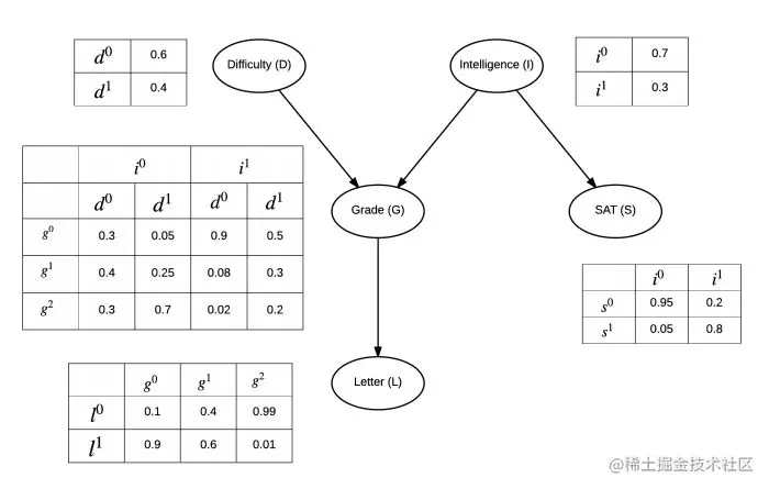 我们以学生获得推荐信质量这样一个例子来进行贝叶斯网络的构造。具体有向图和概率表如下图所示:
