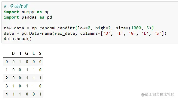 除了以上构造贝叶斯网络的方法之外,我们还可以基于pgmpy进行数据训练。首先生成模拟数据并以上述的学生推荐信的模型变量进行命名: