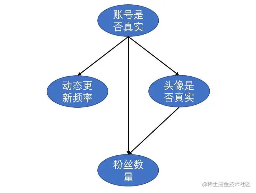 先以一个例子进行引入。假设我们需要通过头像真实性、粉丝数量和动态更新频率来判断一个微博账号是否为真实账号。各特征属性之间的关系如下图所示: