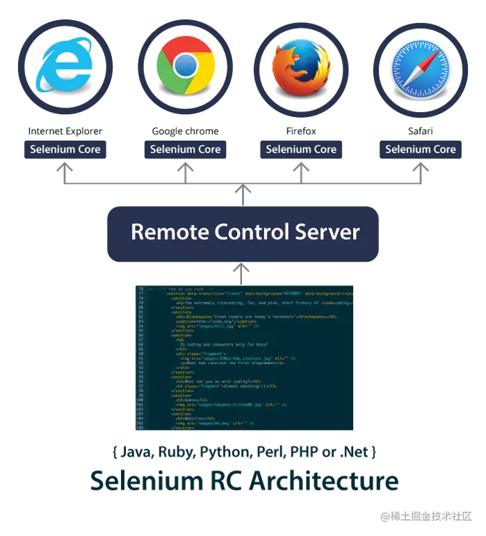 在谈论 Selenium RC 的细节之前,我想回过头来谈谈 Selenium 项目中的第一个工具。Selenium Core 是第一个工具。但是,由于采用了同源策略,Selenium Core 在跨域测试方面遇到了障碍。同源策略禁止 JavaScript 代码访问与启动 JavaScript 的位置不同的域上托管的 Web 元素。 为了克服同源策略问题,测试人员需要安装 Selenium Core(JavaScript程序)和包含要测试的 Web 应用程序的 Web 服务器的本地副本,以便它们属于同一域。这导致了 Selenium RC 的诞生,这是当时 ThoughtWork 的工程师 Paul Hammant 认可的。RC 通过使用 HTTP 代理服务器来“欺骗”浏览器,使其相信 Selenium Core 和被测试的 Web 应用程序来自同一域,从而解决了该问题。因此,使 RC 成为双组件工具。
