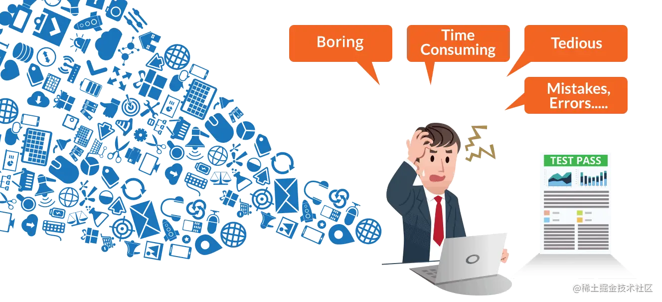 看看上图中这个糟糕的小伙子,他要手动验证记录的交易。他正面临的挑战会导致疲劳、无聊、工作延迟、错误和失误(由于手动操作)。这导致了 Selenium(自动化测试工具)的发明。