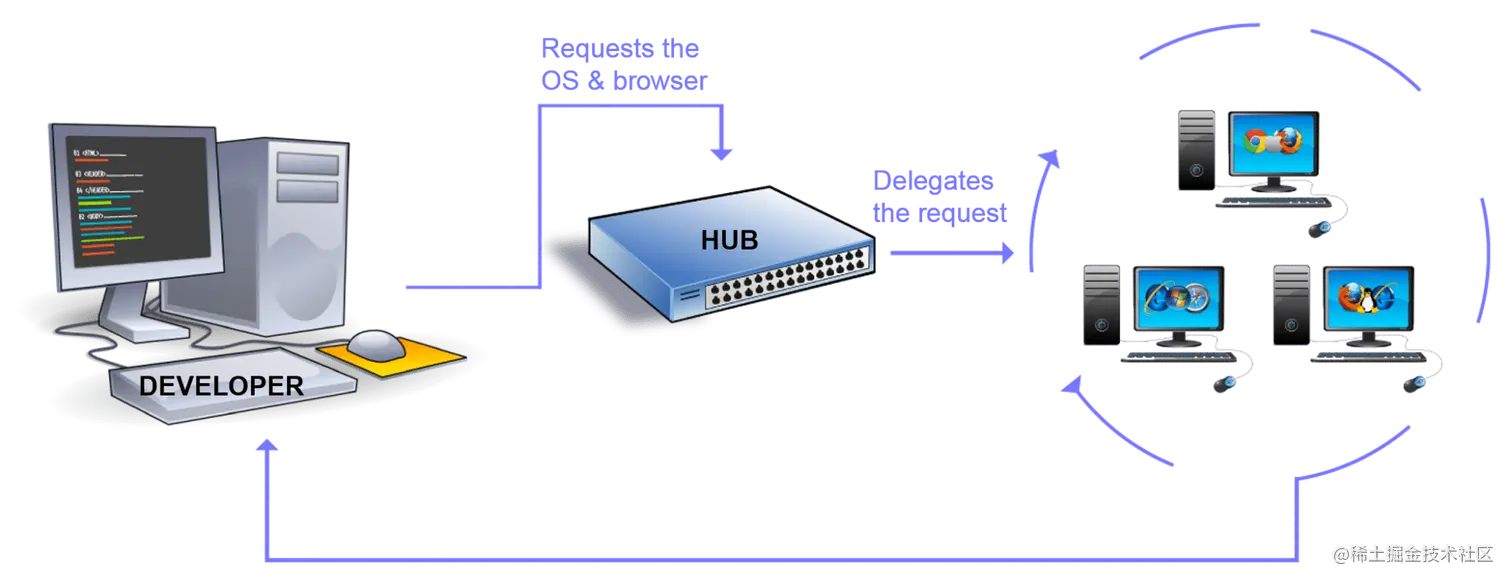 借助 Hub-Node 架构实现并行执行。一台机器将承担集线器的角色,其他机器将充当节点。集线器控制在各种操作系统内的各种浏览器上运行的测试脚本。在不同节点上执行的测试脚本可以用不同的编程语言编写。