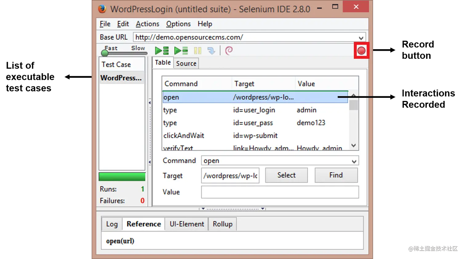 2006年,日本的 Shinya Kastani 将他的 Selenium IDE 原型捐赠给了 Apache 的 Selenium 项目。这是一个用于快速创建测试用例的 Firefox 插件。IDE 实施了记录和回放模型,其中通过记录用户与 Web 浏览器的交互来创建测试用例。这些测试然后可以播放任意次。