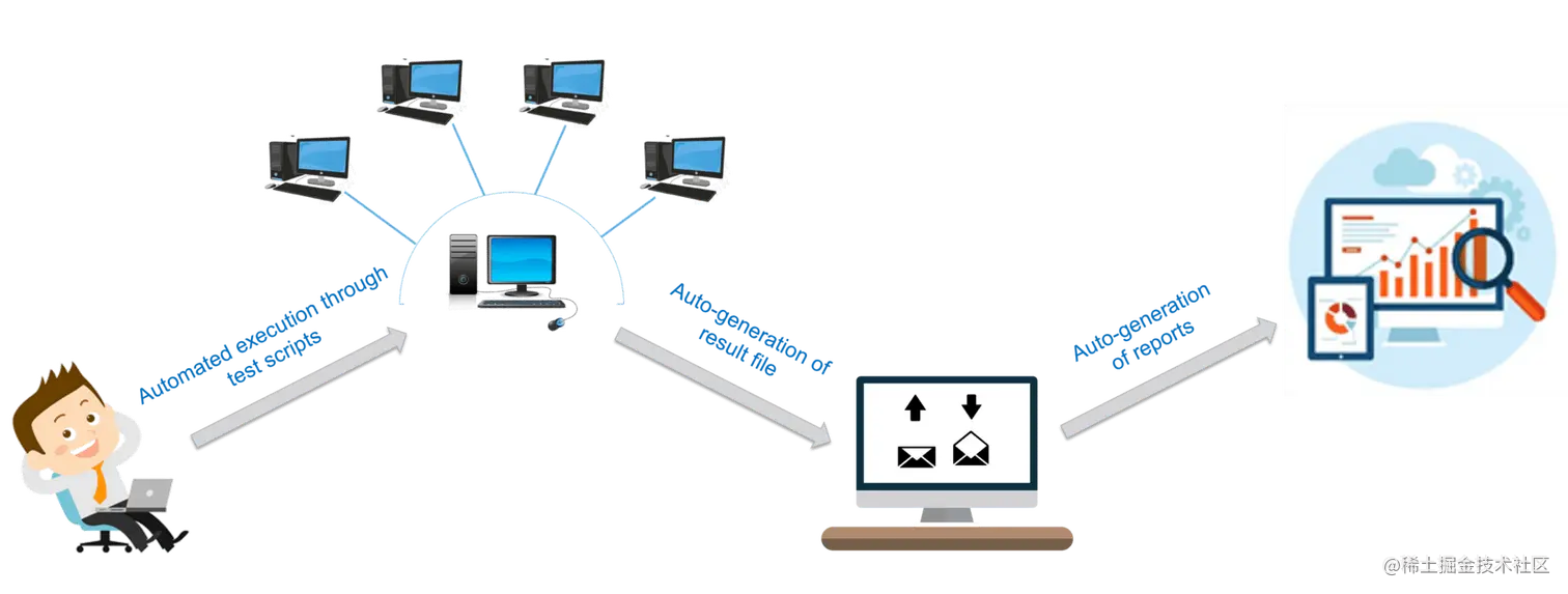 关键是自动化测试使测试人员的工作变得更加简单。如下图所示,显示了一个更宽松的环境,同样的测试人员正在工作。