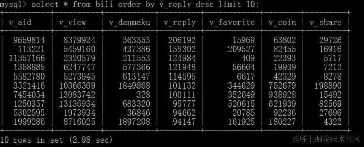 查询回复量前十的视频********