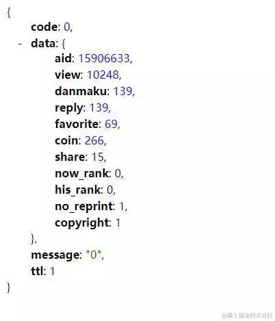 复制下来,去除没必要的内容,得到https://api.bilibili.com/x/web-interface/archive/stat?aid=15906633 ,用浏览器打开,会得到如下的 json 数据