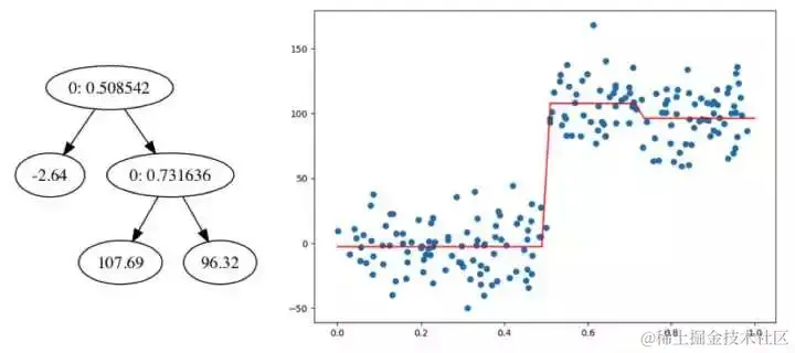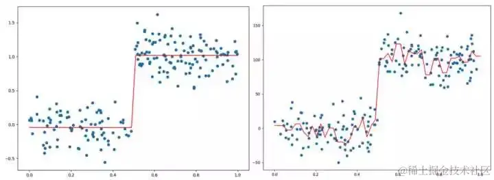 左右两边的数据的分布基本相同但是使用相同的参数得到的回归树却完全不同左边的回归树只有两个分支,而右边的分支则有很多,甚至有时候会为所有的数据点得到一个分支,这样回归树将会非常的庞大, 如下是可视化得到的两个回归树: