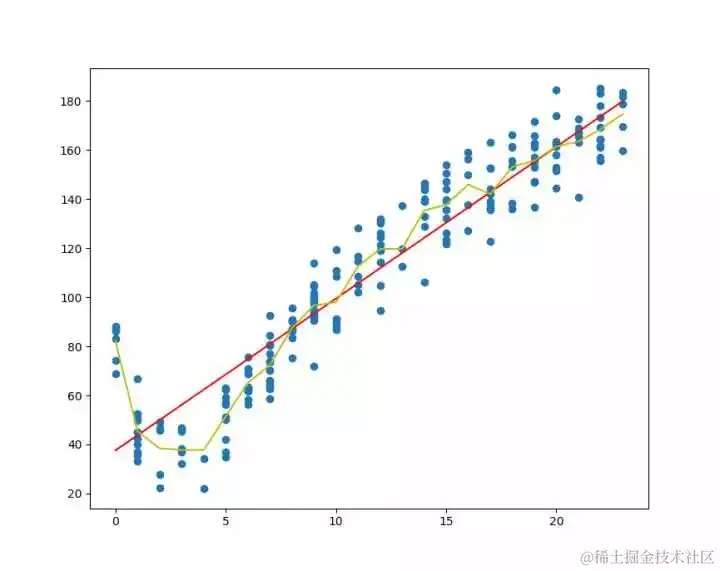 绘制线性回归和树回归的回归曲线(黄色会树回归曲线,红色会线性回归):