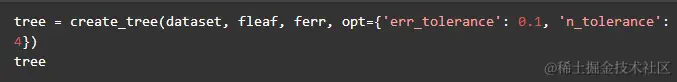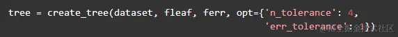 fleaf是创建叶子节点的函数引用,不同的树结构此函数也是不同的,例如本部分的回归树,创建叶子节点就是根据分割后的数据集平均值,而对于模型树来说,此函数返回值是根据数据集得到的回归系数。ferr是计算数据集不纯度的函数,不同的树模型该函数也会不同,对于回归树,此函数计算数据集的方差来判定数据集的纯度,而对于模型树来说我们需要计算线性模型拟合程度也就是线性模型的残差平方和。