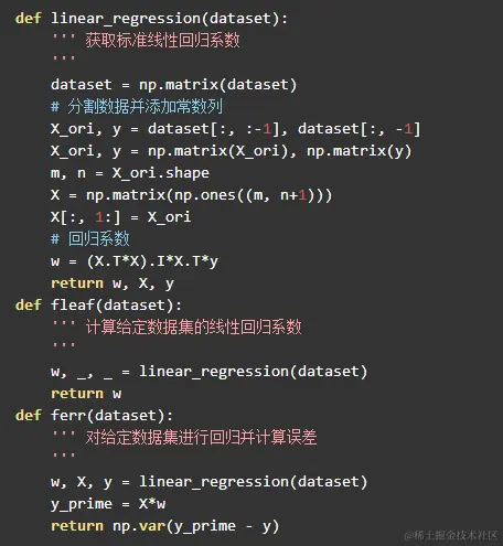 为了能为叶子节点计算线性模型,我们还需要实现一个标准线性回归函数linear_regression, 相应模型树的ferr和fleaf的Python实现