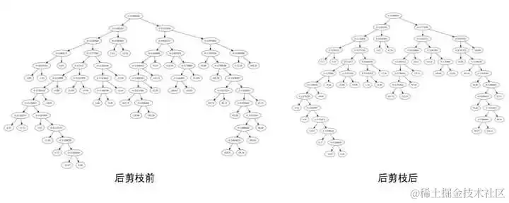 通过输出可以看到总共进行了8次剪枝操作,通过把剪枝前和剪枝后的树可视化对比下看看: