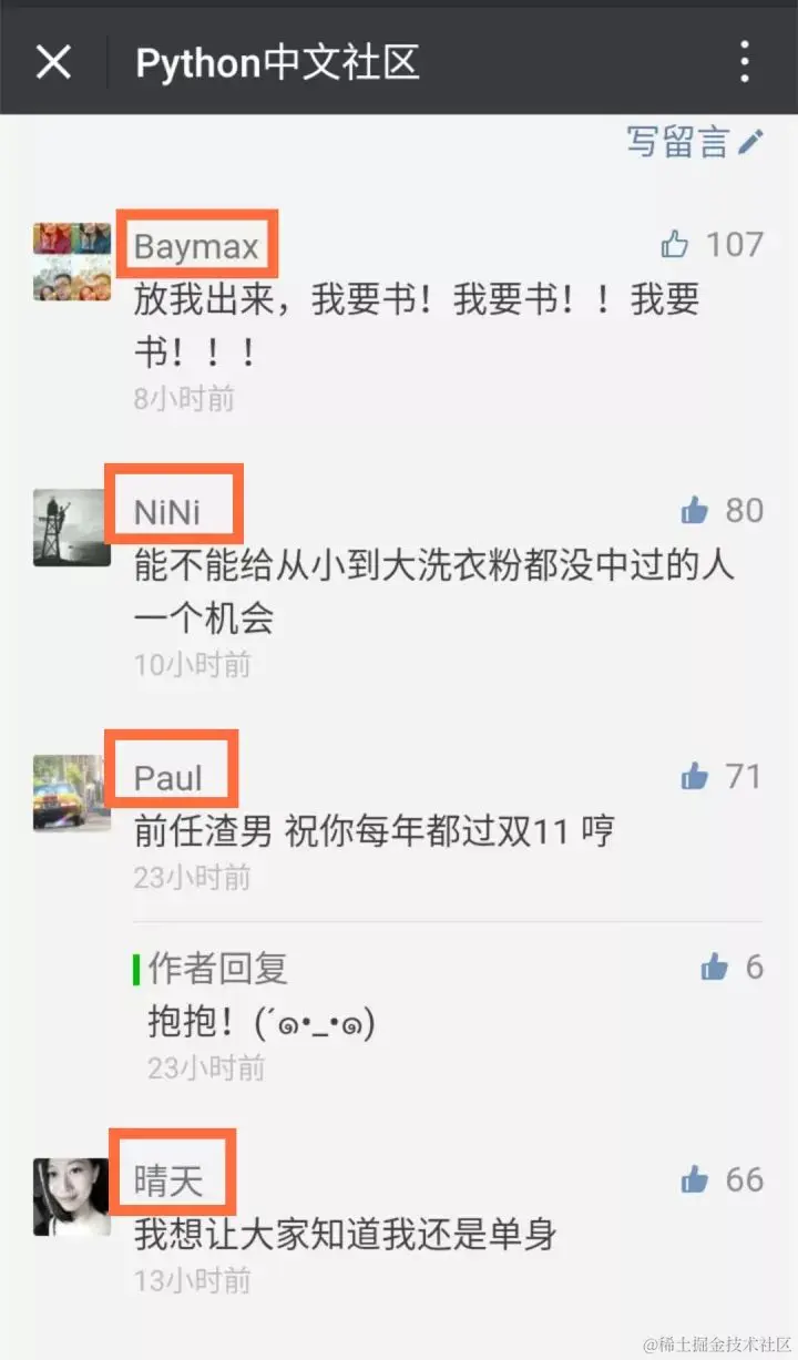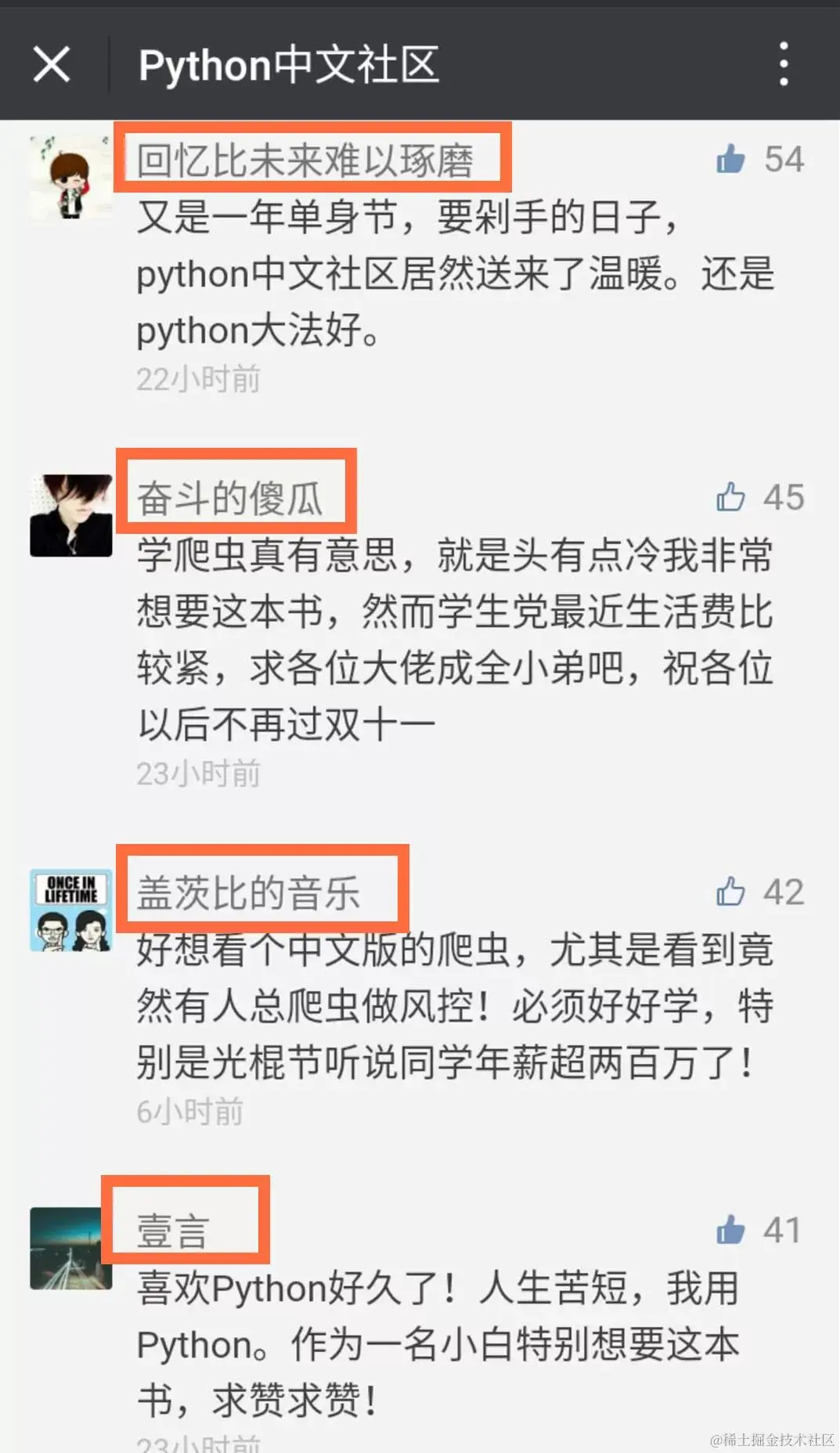 Python中文社区光棍节活动获奖名单 开发者阿橙 2021-04-22 85 阅读1分钟 颁奖啦!\ \ **获奖名单 ** \ 恭喜以上十位童鞋每人获得价值50元的图书一本,请联系阿橙提供邮寄信息领取奖品!(添加阿橙微信:AndyWong188,注明:“双十一获奖”) 因奖品和留言数目有限,未获奖和未入选留言的童鞋加油↖(^ω^)↗,祝各位明年不再过光棍节!希望大家继续为Python中文社区打call!感谢大家的参与!\ \