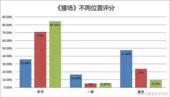 《猎场》剧评评分分布 我们将三个位置的评分放在一起比较就会出现非常明显的差异。根据这个差异,我们可以大致判断:写出短评或者剧评的观众大部分给予了“好评”,但仍有大量观众直接给了差评,并没有说明任何原因。当然,我们并没有考虑那些不写评论,而只是点“有用”和“没用”观众。