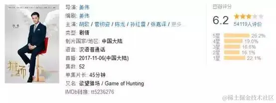 11月6日,湖南卫视已经开播被称作年度压轴的大戏“猎场”,迅速占领各大榜单,成为一部高热度的电视剧。但是在豆瓣上却形成了两极分化。截止11月8日,该剧在豆瓣上的评分为5.7分。相比较胡歌之前《琅琊榜》的9.1,《伪装者》的8.3等来说,这一评分确实不高。有趣的是,首页的评分比例与“短评”“剧评”的比例存在非常大的差异!