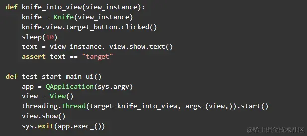 而单元测试的函数是这样的,首先初始化一个参数为view的实例的类,这个类用于拦截信号槽,并执行信号动作,我把这个类命名为Knife。