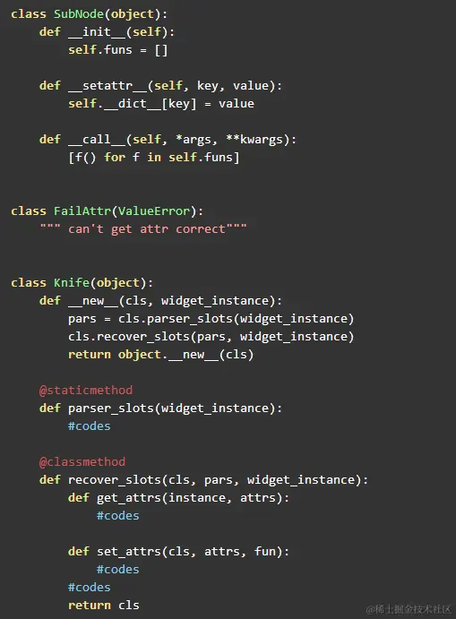 这里用一个叫Knife的类来实现,在重建新的信号函数的时候我希望信号函数的调用方式和程序源代码里的调用方式保持一致,这里就得采用动态的生成方式。而涉及到类成员的动态生成,采取一种不一样的写法比较好,比如把生成的时间从init方法中提前到new方法中。