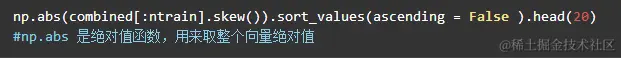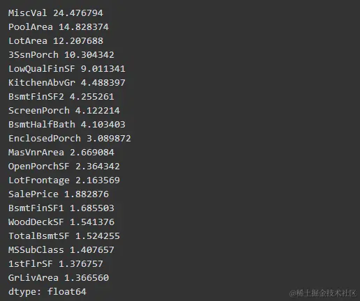 看起来蛮厉害,前面20个特征偏度都超过了1.36。后期需要处理