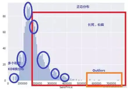 文章开头已经介绍过了,销售价格是正态分布,但是长尾(high skews)且有离散点(outliers)
