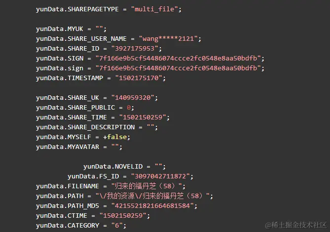 定位到4个shareid,前三个与该资源无关,是其他分享资源,最后一个定位到该 html 文件的最后一个标签块里。双击后可以看到格式化后的 js 代码,可以发现我们要的信息全都在里边。如下节选: