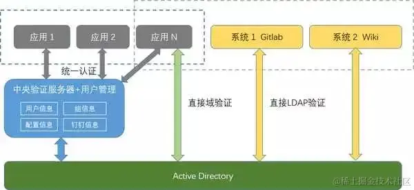 通常在企业中,每个用户拥有一个唯一的身份标识,即用户名。同时用户在其他内网或外部应用也存在着对应的用户,如果能使用同一个用户身份最为方便;独立的用户可以通过关联不同的系统的用户使之对外呈现为一个用户。用户可以在不同的应用系统中使用,这一切的基础是有一个中央的系统来保存和管理这些用户。常见的解决方案有Windows活动目录和LDAP。