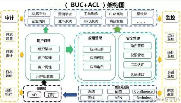 基于此,笔者所在运维技术团队基于Python建设了统一认证(BUC:Back User Center)和权限控制(ACL:Access Control List)平台,这个系统技术架构图如下: