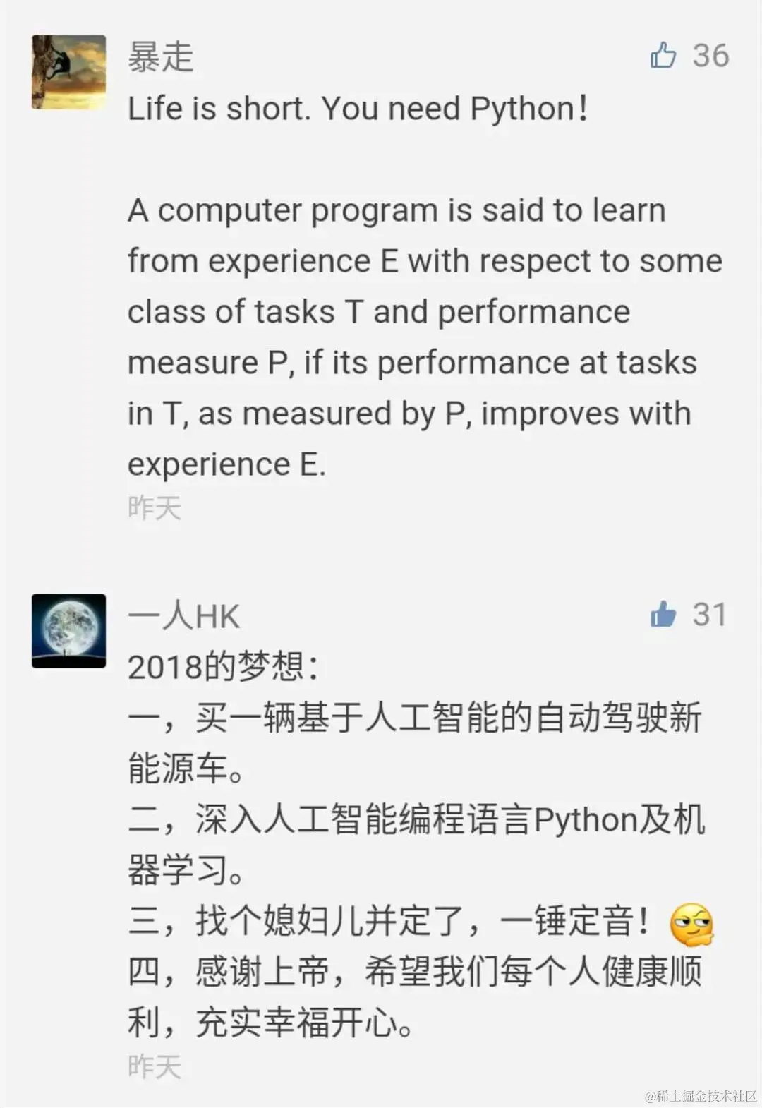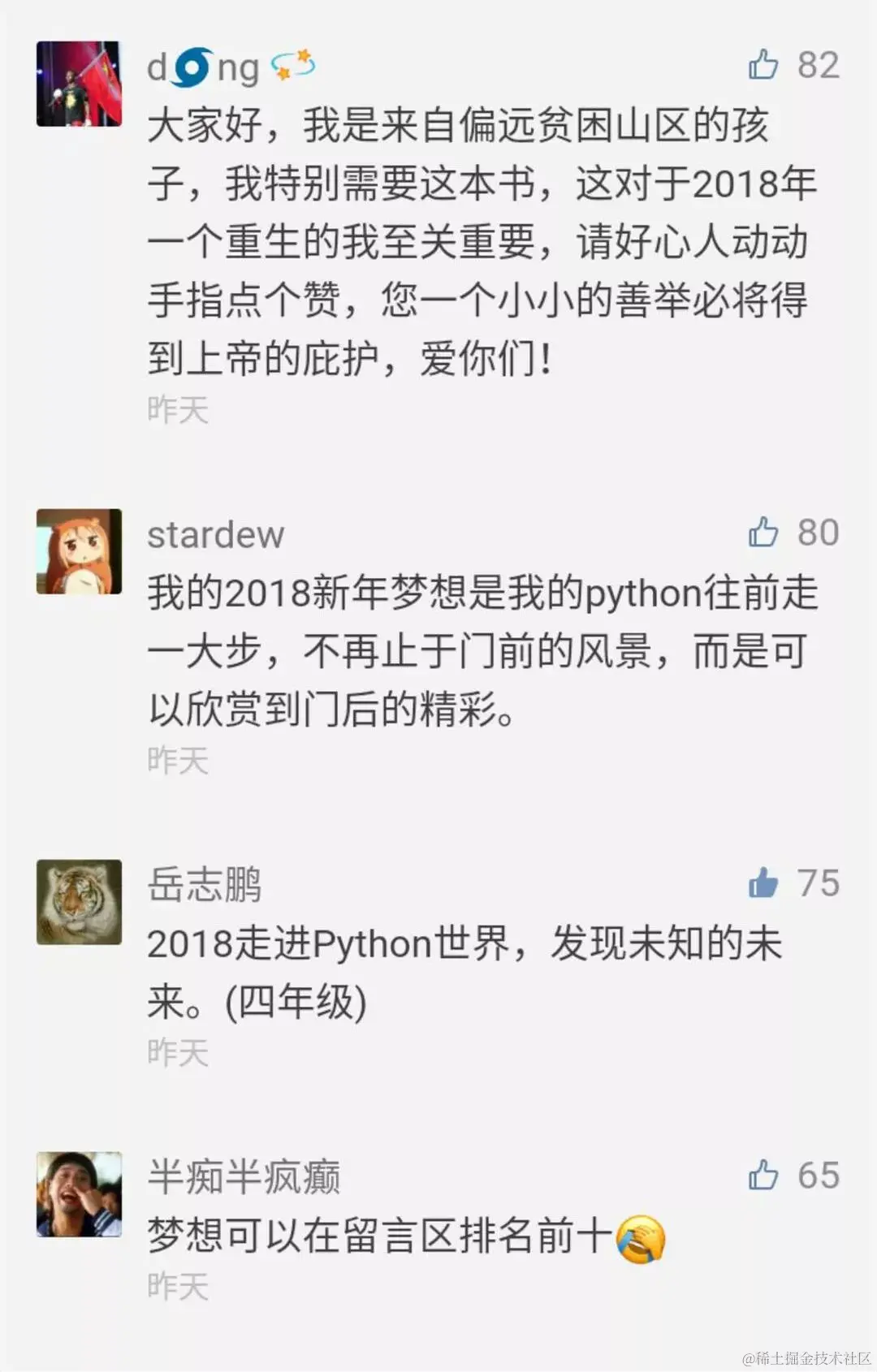 恭喜以下10位同学免费获得由电子工业出版社提供的《Python与机器学习实战》图书一本。由于微信文章留言数量限制,很多后来朋友的留言未能显示出来,希望能体谅,感谢大家的积极参与,福利多多,下次再会吧!