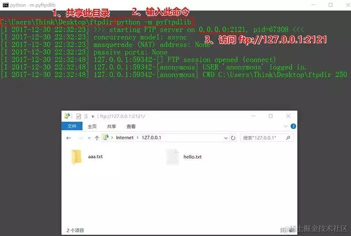 上述的一行命令已经可以实现一个简单的FTP服务器,但是要搭建一个功能强大完善的FTP服务所涉及到的配置较多,这时需要使用Pyftpdlib提供的 API 来编写。如下是一个简单的示例