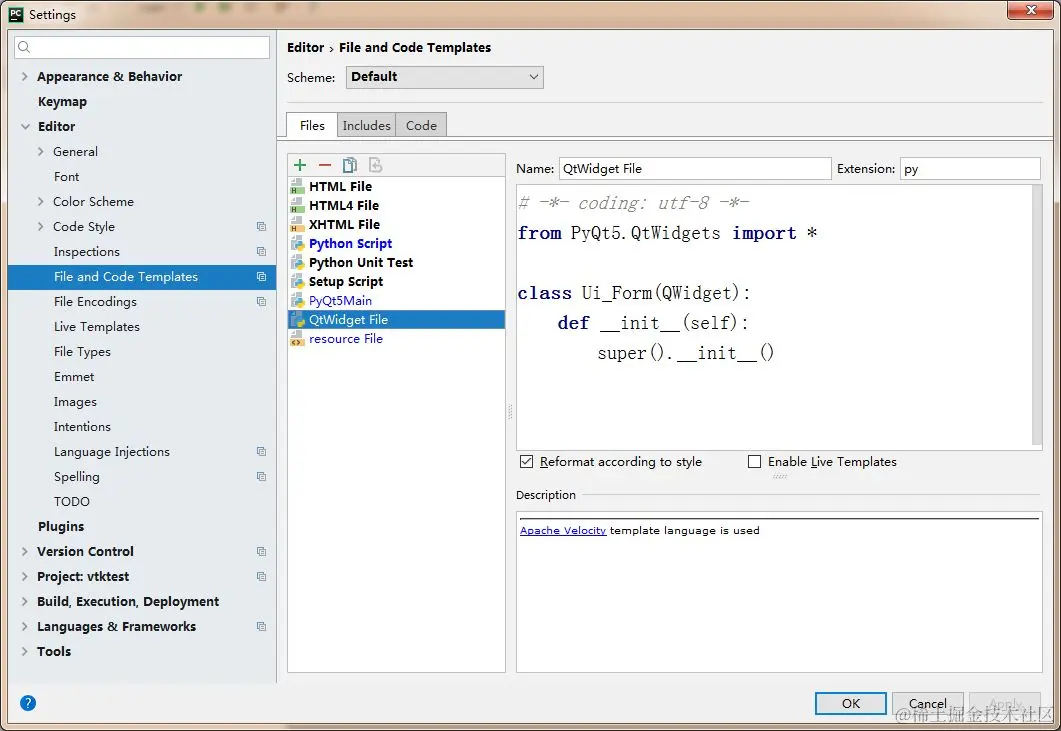 单击“+”号可创建模板,然后在Name文本框中输入名字,在Extension文本框中输入扩展名(如:py),在下面的大文本框中输入文件模板内容即可。 笔者为PyQt5开发建立了3个文件模板,2个py文件模板(窗口文件模板和主程序文件模板)和1个qrc文件模板(资源文件)。设置如下: